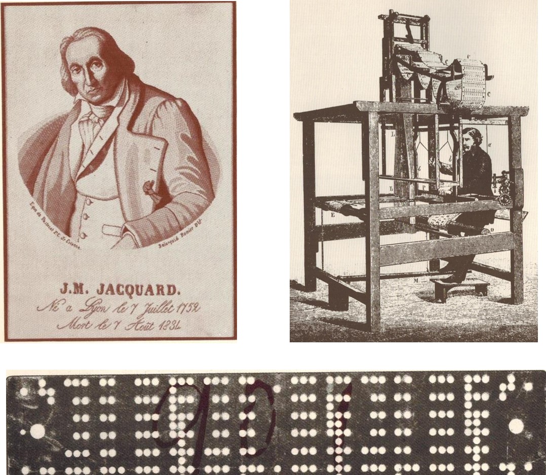 Nel 1804 il francese Joseph-Marie Jacquard perfeziona l’idea del meccanico Falcon che un secolo prima aveva scoperto un nuovo sistema per rendere automatiche alcune fasi del lavoro di tessitura.